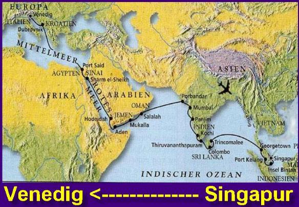 http://www.phoenix-reisen.de/Kreuzfahrtverlauf + Schiff (zum Vergrößern anklicken)Nach dem langen Winter zuhause freuten wir uns auf diese Reise in tropische Gefilde mit hochsommerlichen Temperaturen und wir fanden dafür schon Ende letzten Jahres für diese Route das Schiff MS AMADEA, welches heuer von Phoenix-Reisen in Bonn gekauft wurde. Dieses bisher japanische Schiff MS ASUKA wurde jetzt in Yokohama komplett renoviert, auf europäische Ansprüche umgebaut und auf MS AMADEA umgetauft. Sie ist jetzt mit "4-Sternen Plus" das Flaggschiff von Phoenix-Reisen und startete Anfang März ab Tokio zur Jungfernreise bis Hamburg. Wir wählten den 2. Abschitt dieser Reise, der von Singapur nach Venedig ging und wir genossen das Kreuzen über 7 Meere in 4 Wochen mit interessanten Stationen und speziellen Ausflügen. Wie immer hatten wir mit dem Wetter Glück, denn außer einem kurzen Gewitter bei Ankunft in Singapur, war immer "reichlich Sonnenschein". Wir konnten bei dieser Reise 10 Länder besuchen und es wurden 18 Häfen angelaufen. Die Ausflüge in den angelaufenen Häfen waren gut organisiert, die vorab über den Kabinen-TV angebotenen Informationen dazu waren sehr gut, jedoch nahmen wir auch öfters mal ein Taxi um unabhängiger zu sein. Ein Highlight dieser Kreuzfahrt war dabei auch die 10-stündige Passage des Suezkanals. In Sri Lanka verließen wir das Schiff in Trincomalee im Nordosten der Insel, mieteten ein Auto mit Fahrer und fuhren nach Kandy. Am nächsten Tag fuhren wir weiter nach Colombo im Südwesten und gingen dort wieder an Bord unseres Schiffes. Geplant hatten wir eigentlich den Besuch unseres Patenkindes bei Badulla, jedoch war dies zeitlich leider nicht möglich. Weiteres erfahrt Ihr durch Anklicken der linken Buttons |
