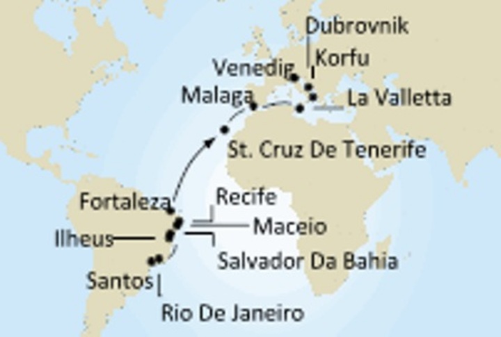 Link zum Schiff > M/S COSTA Fortuna Kreuzfahrtverlauf + Schiff (zum Vergrößern anklicken)Unser diesjähriger Reisewunsch war die einzige uns noch fehlende Ozeanüberquerung und dies betraf den Südatlanik. So suchten wir nach einer Kreuzfahrt, mit der wir dieses Reiseziel verbinden konnten. COSTA bot mit der M/S Fortuna eine Reise von Santos nach Venedig an und wir entschlossen uns diese zu buchen. Start- und Zielhafen weckten auch Erinnerungen an meine früheren beruflichen Aufenthalte. Wir flogen nach Sao Paulo und mit einer schönen Busfahrt ging es zur Hafenstadt Santos. Auf der anschließende Kreuzfahrt von hier mit mehreren Stopps gen Norden Brasiliens hatten wir die Möglichkeit antike Kulturstädte zu besuchen. Die Ausflüge in den diversen Anlaufhäfen waren auch sehr gut organisiert. In den folgenden 5 Seetagen im Atlantik überquerten wir den Äquator und bei schönem Wetter wurde es nie langweilig an Bord. Fazit: Brasilien ist nach wie vor arm und dadurch noch sehr kriminell, haben dies aber nicht erlebt. Während der 3-wöchigen Kreuzfahrt hatten wir großes Glück mit dem Wetter und erlebten eine wunderbare Zeit in den brasilianischen Städten. Mit dieser 12. Kreuzfahrt haben wir nun das Dutzend erreicht, den Globus umrundet und die für uns interessanten Plätze auf unserem Globus gesehen. Sie sollte auch unsere letzte große und lange Kreuzfahrt auf dieser Kugel sein. Wenn es die Gesundheit erlaubt, können wir auch künftig in unserer näheren Umgebung kreuzen, z.B. in der Ostsee oder dem Mittelmeer, denn da gibt es auch einige schöne und sehenswerte Anlaufstationen, die wir noch nicht kennen.