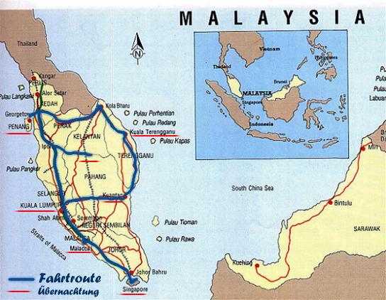 Reiseverlauf (zum Vergößern anklicken) Unser 1. Urlaub in Südostasien sollte nach Indonesien, Singapur und Malaysia gehen. So planten wir die Insel Bali und nach einem Abstecher in Singapur von hier mit einem Mietwagen auf eigene Faust Malaysia kennenzulernen. Es war eine schöne und sehr interessante Reise, leider kam es durch die starken Waldbrände auf Sumatra zu Haze (dichter Nebel), wodurch wir über 1 Woche keine Fernsicht in Singapur & Malaysia hatten.