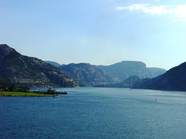 | Auf der letzten Etappe von Bergen zurück nach Bremerhaven kreuzten wir noch bei strahlendem Sonnenschein durch den Lysefjord bis zum 600 m hohen Preikestolen (Predigtstuhl). |