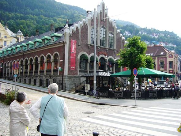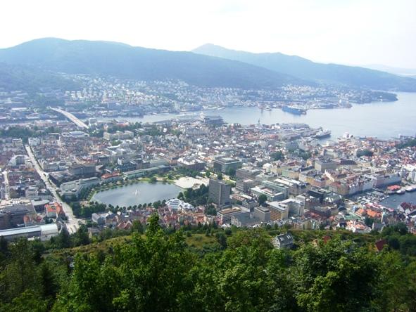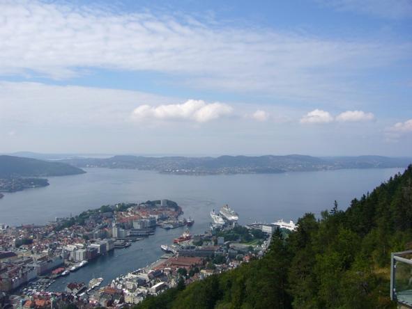 | Bergen ist mit seinen heute 230.000 Einwohnern eine lebhafte Hafen- und Handelsstadt und war jahrhundertelang die größte und wichtigste Stadt Norwegens und wird noch immer "heimliche Hauptstadt" genannt. In jedem Fall ist ein Besuch dieser Stadt noch immer ein "Muß" auf jeder Norwegenreise. Die Sehenswürdigkeiten, wie Kirchen, Museen und das Hanseviertel Bryggen sind zu Fuß gut zu erreichen, sie liegen um das Hafenbecken herum. Für einen wunderschöne Aussicht über die Stadt lohnt es sich mit der Fløyenbahn bei gutem Wetter zum Hausberg Fløyen in 320 m Höhe hinaufzufahren. Wir hatten dieses Glück und erlebten den Tag bei herrlichem Sonnenschein. Das war ein Glücksfall, denn bekanntlich gilt Bergen als die regenreichste Stadt der Welt. |