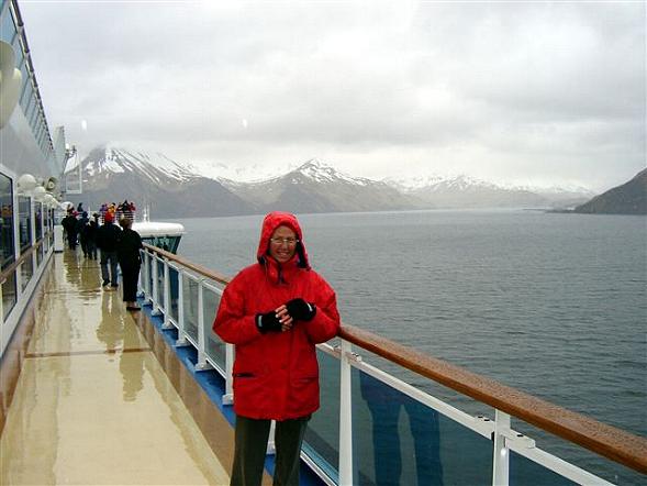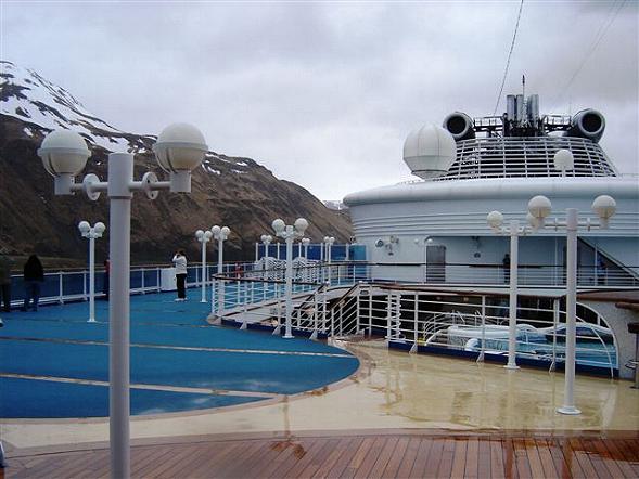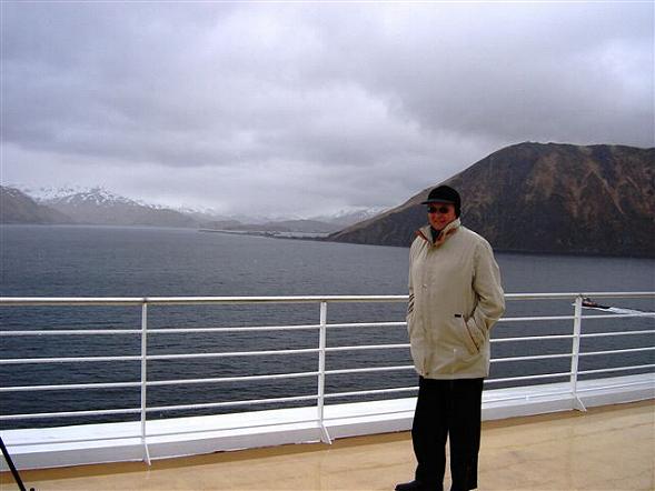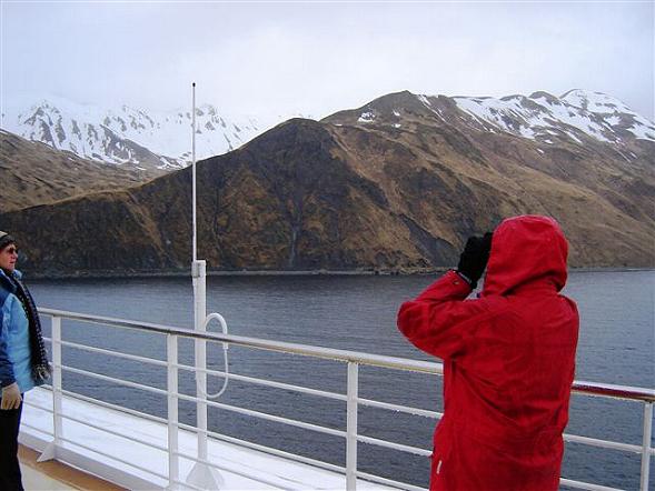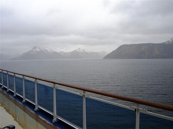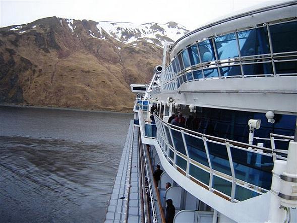 Nach 5 Seetagen ab Japan sahen wir hier zum ersten Mal wieder Land, allerdings konnte unser großes Schiff nicht anlegen, wir lagen nur einige Stunden im Hafenbecken und nahmen die amerikanischen Zollbeamten an Bord, die dann am nächsten Tag an Bord die umfangreichen amerikanischen Zollkontrollen aller Passagiere und dem Personal vornahmen. Ohne diese jetzt zeitraubende persönliche Paßkontrolle würde sonst bei den nächsten Stopps in Alaska zuviel Zeit an Land verloren gehen. |