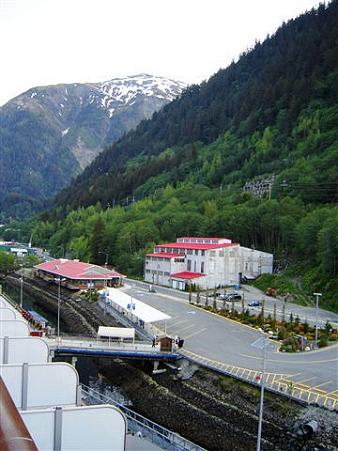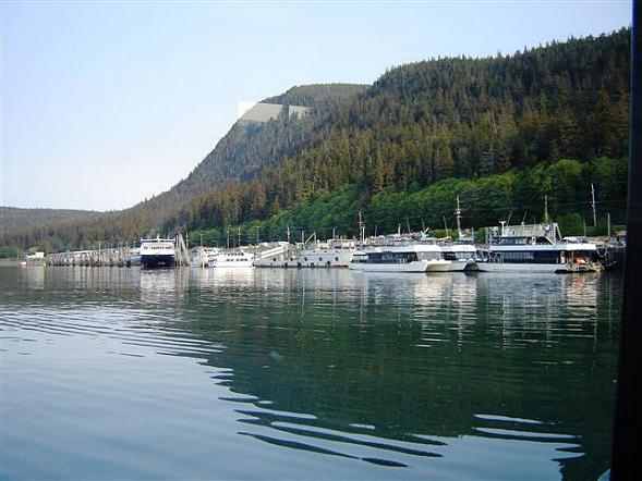 | Juneau ist mit 31.000 Einwohnern die Hauptstadt Alaskas und liegt malerisch in der Bucht vor dem Mount Juneau. Um 6:15 Uhr verließen wir bereits das Schiff, um mit einem Katamaran auf Tiersuche zu fahren und konnten dann auch Seeadler, Delphine, Seelöwen und einen Humpback Wal sehen. Danach fuhren wir zum Mendenhall-Gletscher, dem weltweit größten Gletscher. Während unser Schiff die Alaska-Saison 2005 eröffnete, staunten wir doch, dass bis Mittag noch 3 weitere Schiffe anlegten, darunter unser Schwesterschiff, die baugleiche Diamond Princess. |