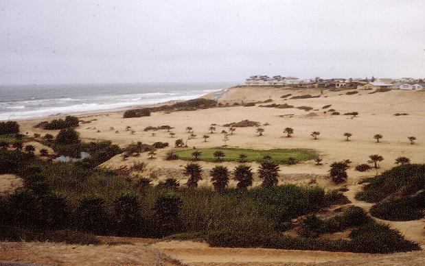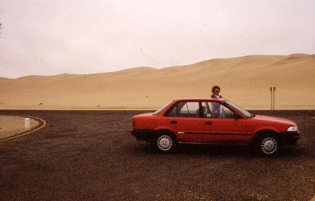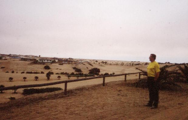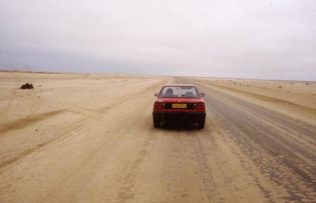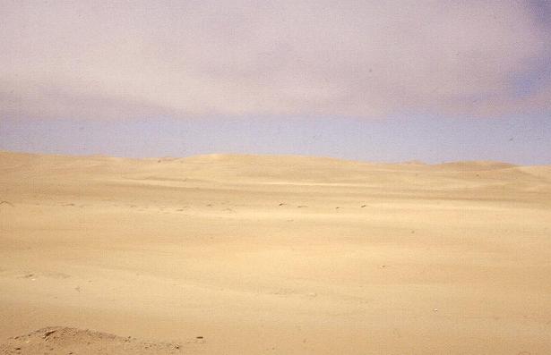 | Die Namib ist mit 200 km Breite und 2000 km Länge eine der größten Wüsten. Es faszinierte uns bei der Fahrt durch die Wüste, daß sich die Farbe des Sandes und so die Landschaft während des Tages veränderte, morgens gelb bis abends rot . |
