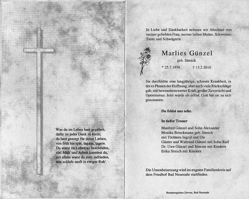 beschäftigt. Leider verstarb unsere liebe Marlies am 13.02.2010 an den Folgen einer schweren Krankheit. Wir werden sie immer als gute Freundin in Erinnerung behalten. Es war schön, daß es dich gab. |
