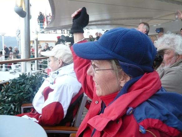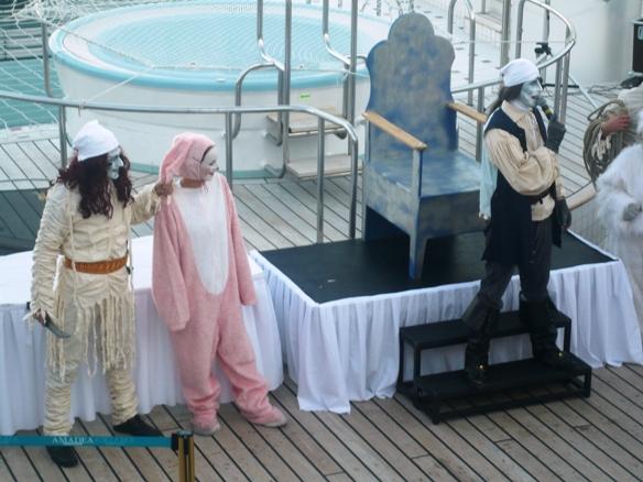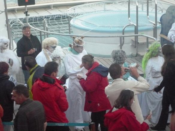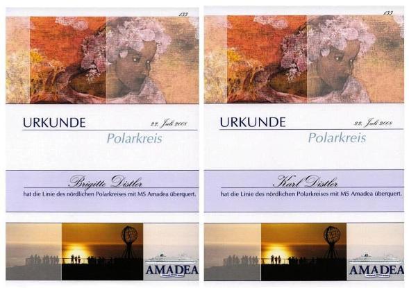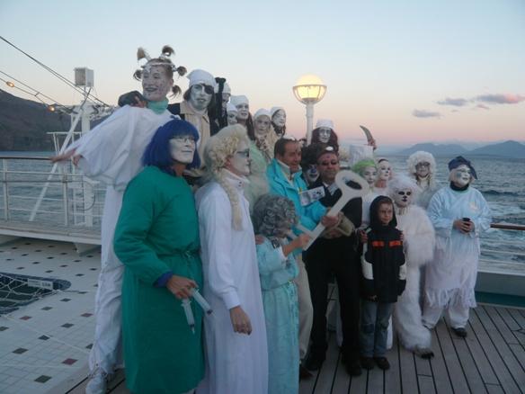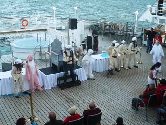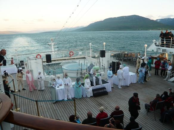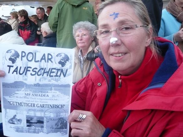 > Lido-Deck achtern < . Der Polargott, Wächter über den Polarkreis und das Polarmeer kam mit seinem Gefolge an Bord ! Alle vom irdischen Staub Beschmutzten wurden untersucht, gestempelt, mit lauterem Wasser gereinigt und in sein eisiges Reich eingelassen, sofern sie für würdig befunden. Diese Zeremonie mit dem Polargott und seinem Gefolge war eine sehr lustige, lautstarke und auch hübsch kostümierte Unterhaltung ohne Sonnenuntergang an Bord. Um 00:25 überquerten wir dann den Polarkreis bei 66o33" Nord. |